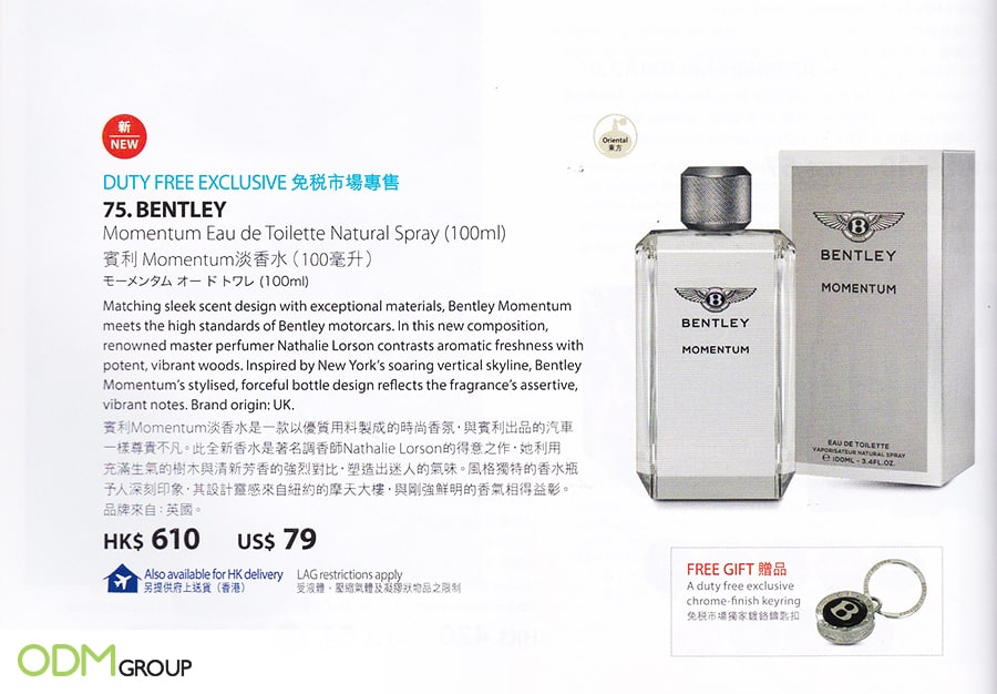 Bentley is currently offering their customers a free branded gift with purchase of their cologne to boost sales. This was promoted in the July / September 2018 Cathay Pacific in-flight duty free magazine.