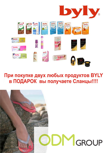 Летнее предложение от косметической марки Byly: при покупке любых двух продуктов получите сланцы в подарок! Предлагая такой промо-подарок к своему продукту, Byly повышает тем самым его воспринимаемую ценность. Поэтому при покупке у покупателя не возникнет сомнений, и выбор падет на продукцию компании Byly.