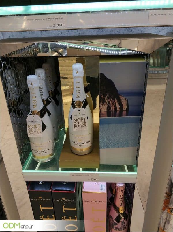 Moët & Chandon promoted its ice imperial with custom packaging in Thailand Duty Free Stores. Customer’s first impression is important and this visual is very eclectic with mirrors, textures and shapes all over the place. The center bottle is on a Gold plinth. Below the display, clients will find a more traditional line up of bottles.