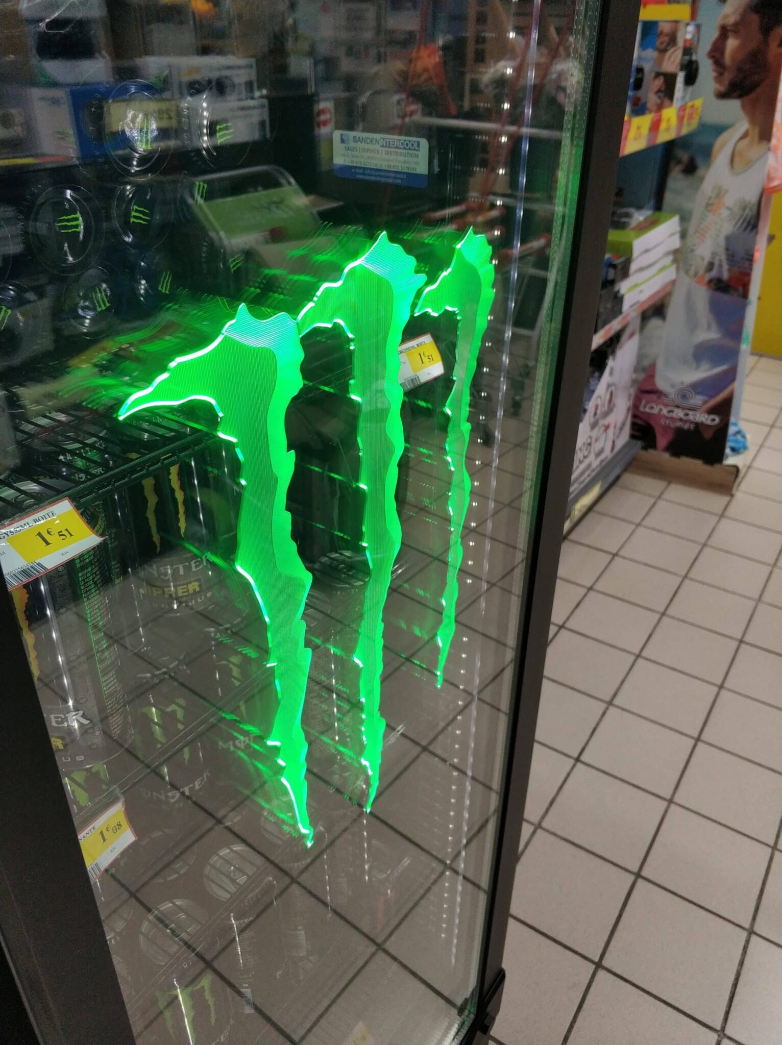 Stocked full of monster energy drinks, this display fridge can certainly be spotted from a distance to instantly entice shoppers. It is simple but memorable.