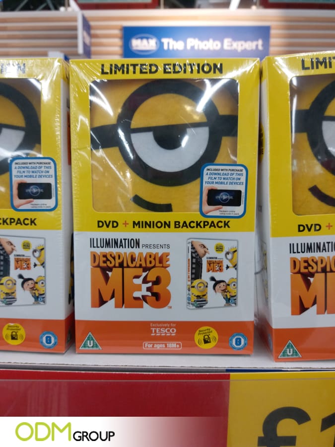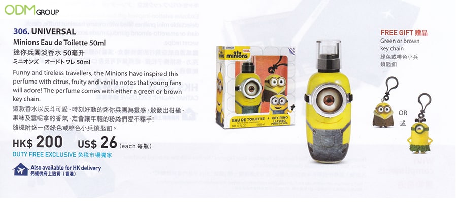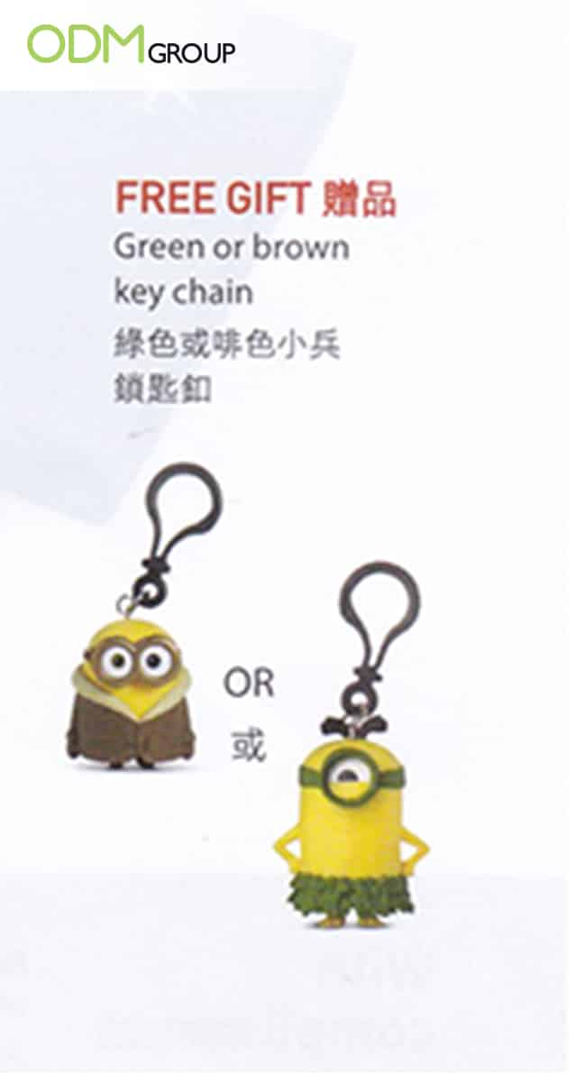 - Impulse Purchase: Shoppers are more likely to make impulse purchases if they are 1.) On holiday 2.) If there is a ‘limited time’ offer – this Despicable Me promotion has taken advantage of both by offering a free gift in a Duty Free magazine. This small price to manufacture the custom keychain design will work wonders in boosting in-flight sales and driving impulse purchases.