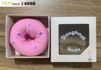 Rolled into a round shape and placed inside a bakery-style box, doughnut socks look so realistic that people often do a double-take. The packaging mimics pastry boxes, making them perfect for F&B promotions tied to cafés, dessert shops, or even seasonal campaigns.