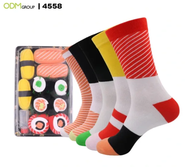 Quirky designs like sushi or burger socks are instant icebreakers. Customers share photos, unbox them on social media, and talk about the brand that gave them away. That’s free word-of-mouth marketing.