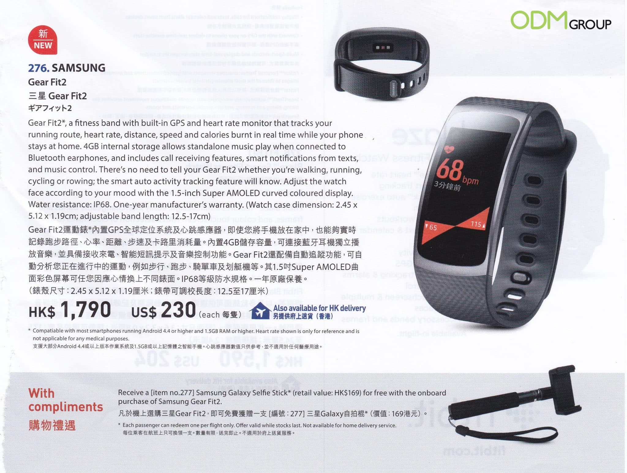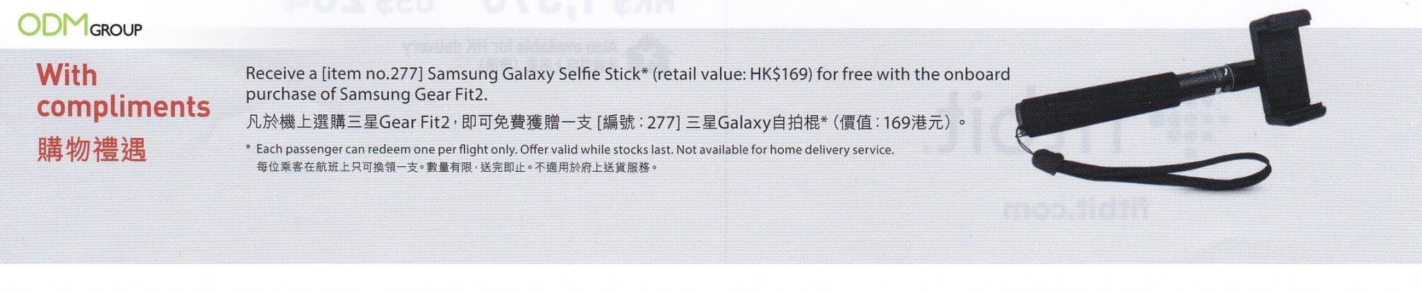 A promotion from Samsung offers customers a free Samsung Galaxy custom selfie stick with every on board purchase of their Samsung GearFit 2. Offering a gift with purchase is a great way to incentivise shoppers to impulse buy, especially with on board sales.