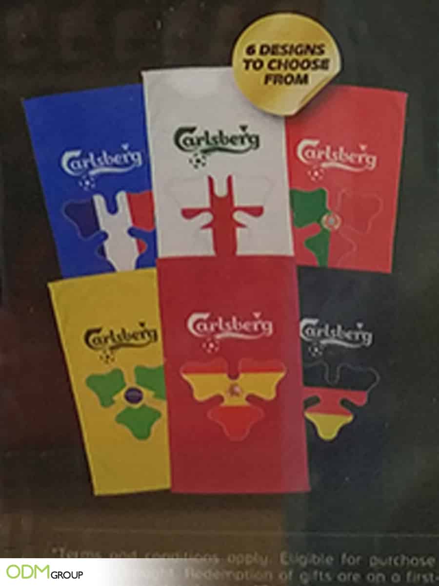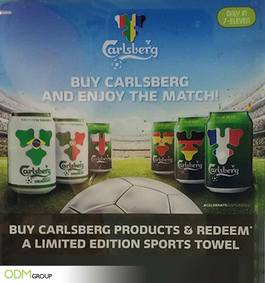 - The Free Branded Sports Towel: The sports towel is a great way to entice customers to buy Carlsberg over other brands. Drinks Promo gift ideas are also likely to increase sales. Sometimes the customer may not intend on buying 6 cans / 4 cans of Carlsberg. With a free gift they are much more likely to spend a bit more knowing they are receiving something in return.