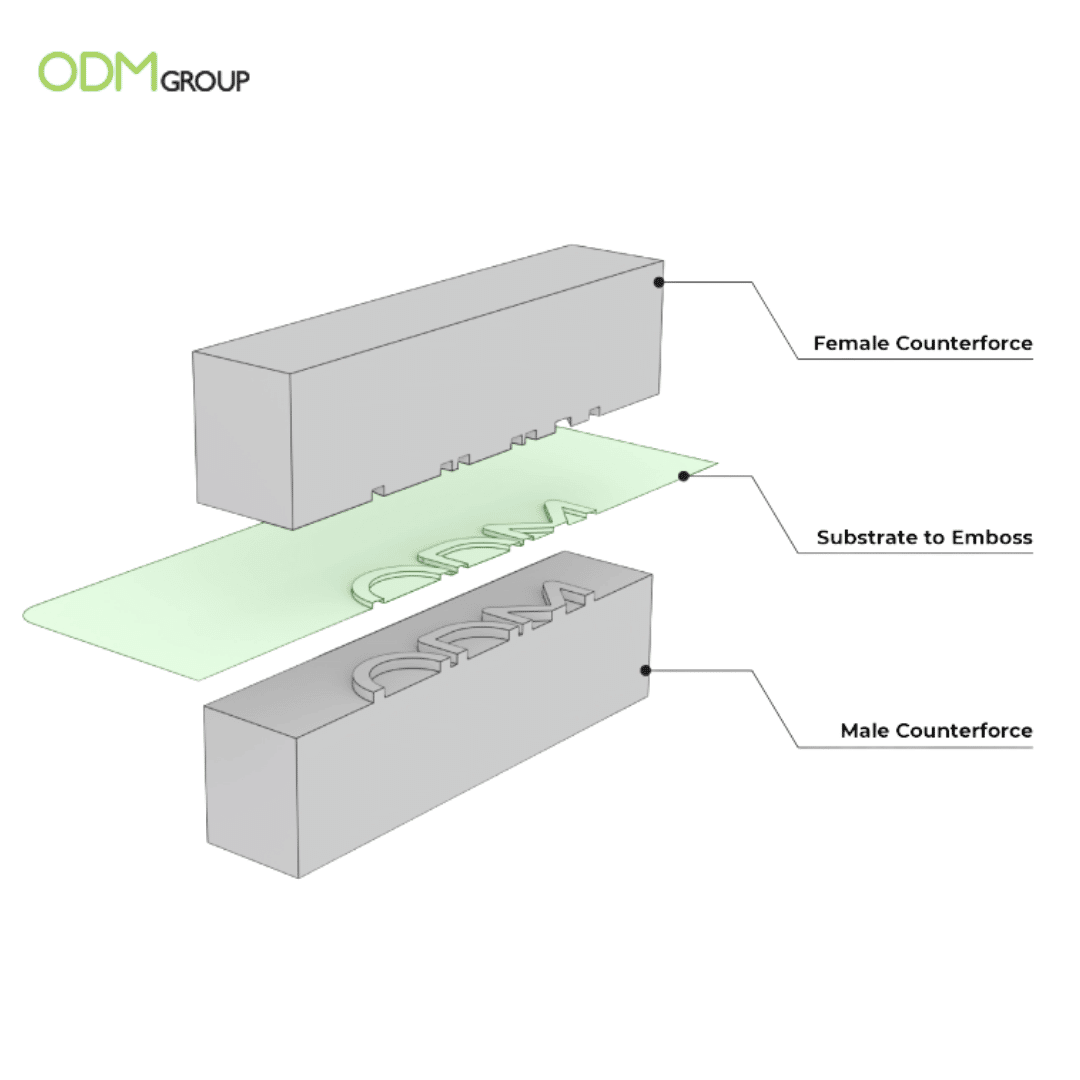 Debossing can be achieved using a metal plate or die that is heated and pressed onto the material using a printing press.