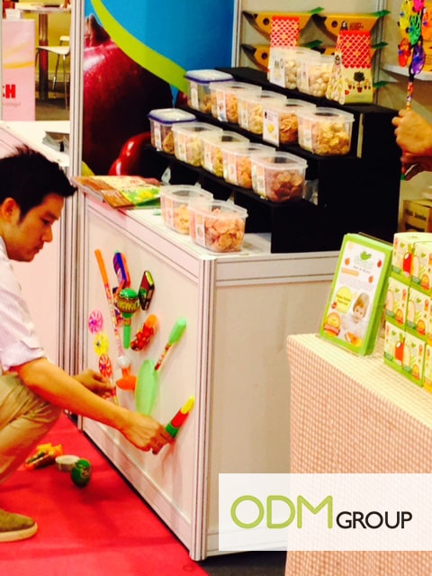 The company on the picture is promoting dried fruits on its booth, nothing really sexy or eye-catching as it’s all packaged in plastic boxes. So what have they done? They decided to come with bubble pistols to grab the attention.