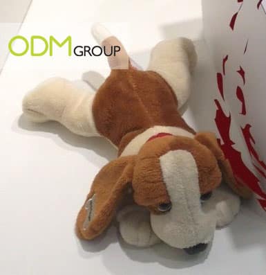 Secondly, the company logo is sewed onto the plush dog. This helps the brand to create an identity on the gift with purchase. Also, when customers see the gift, they would constantly be reminded of Hush Puppies as the brand is sewed on it.