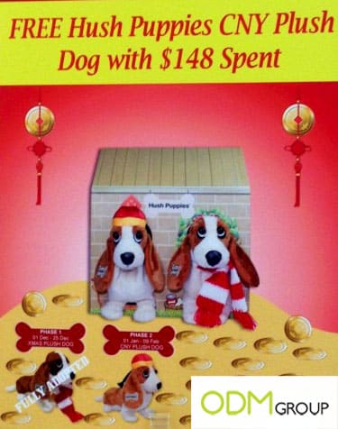 Firstly, the plush toy is representative of the brand. The brand “Hush Puppies” is associated with dogs as its name has “puppies” in it. Hence, giving away the plush dog is an appropriate choice for the brand. Furthermore, the plush dog is the same one as the brand’s logo, making an even greater impact on customers as they can easily link the gift with purchase to the brand.
