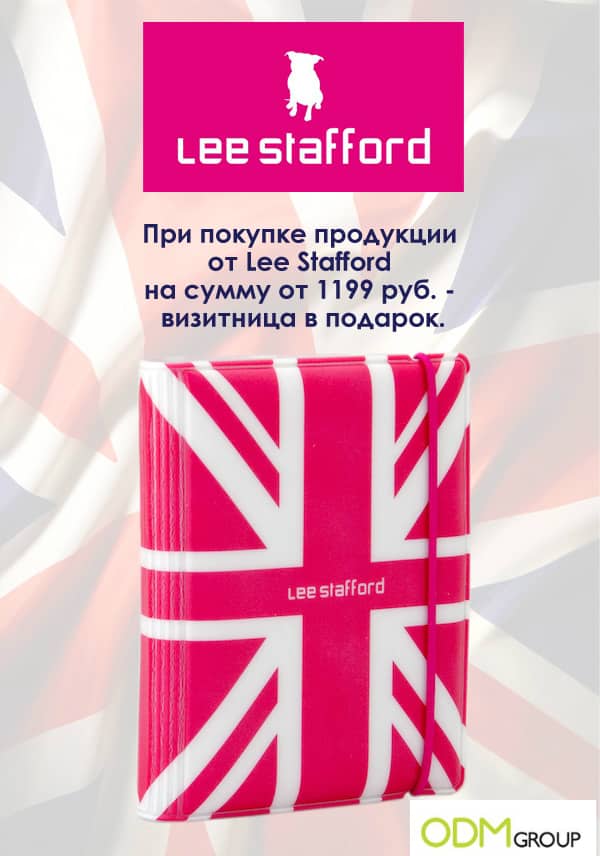 Не пропустите подарок от косметического бренда Lee Stafford. При покупки продукции на сумму от 1199 рублей, Вам подарят стильный ежедневник с изображением английского флага. Промо-акции и промо-подарки помогают Вашему бизнесу привлекать новых клиентов. Cпециалисты компании ODM помогут подобрать наилучший продукт для Вашей акции.