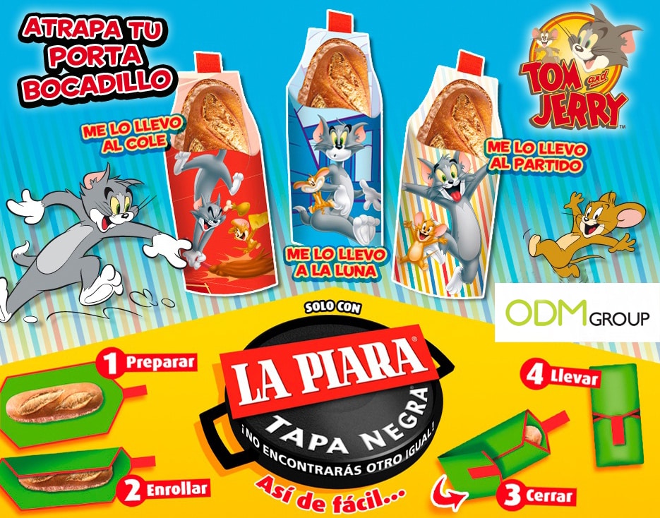 Aquí tenemos una promoción de La Piara, productor de la famosa Tapa Negra. La empresa propone a sus clientes obtener un porta bocadillo gratis por la compra de cada Tapa Negra. La Piara utiliza tambien los dos famosos personajes Tom & Jerry para promover su Tapa negra.