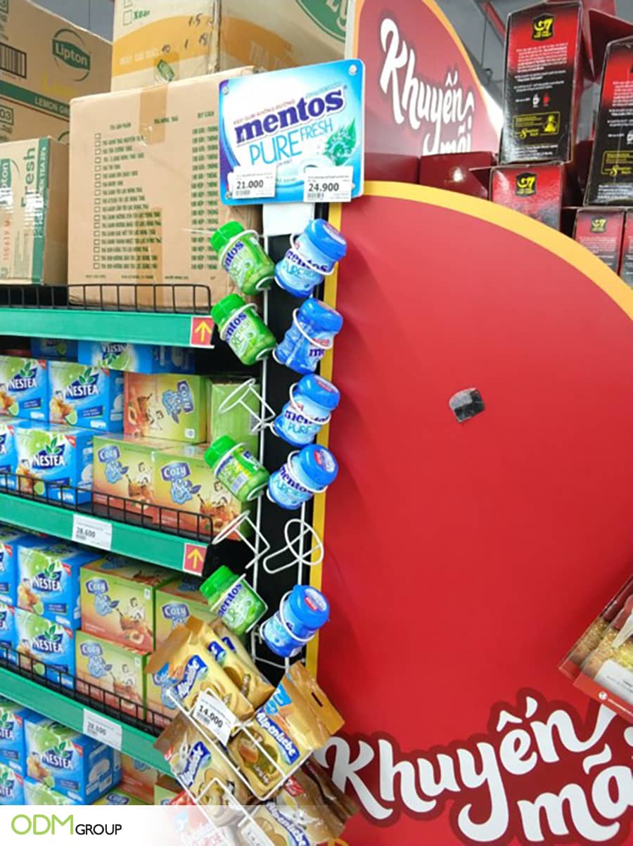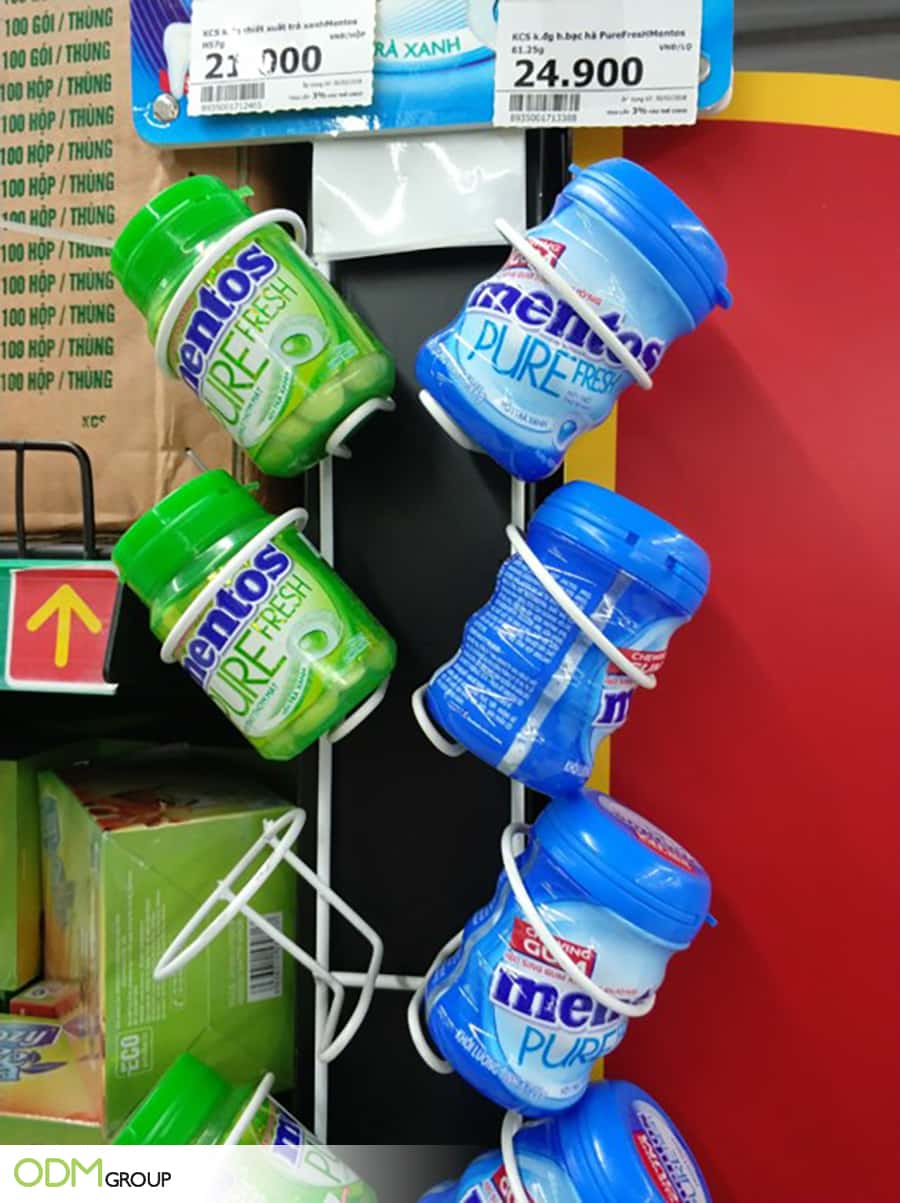 Mentos has recently inspired us with their mounted display stand in Ho Chi Minh, Vietnam. This is a great way to not only market your products but also a very convenient and easy way for customers to select your product. A custom display rack is often used by brands to attract costumers – however, for smaller products, a mounted display stand will be both effective but less costly.