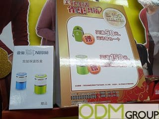 Nestlé advertised recently with great products as Gift with Purchase. You get the Backpack for free, if you spend a minimum of 50 Yuán and if you spend a minimum of 150 Yuán, you will get this food container for free. This branded promotional products are a perfect campaign solution to gain your sales and your brand awareness.