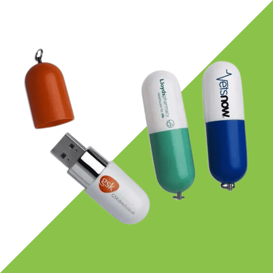 Another promotional item of the same genre is a custom shaped USB in the shape of a capsule as well. It is useful, compact and it captures attention when being used. This product will create buzz, as well as increase brand awareness and visibility. The great thing about these products is that they can be easily customized to suit the medical industry theme. For example, a syringe pen or a holder in the shape of a doctor could do just the trick.