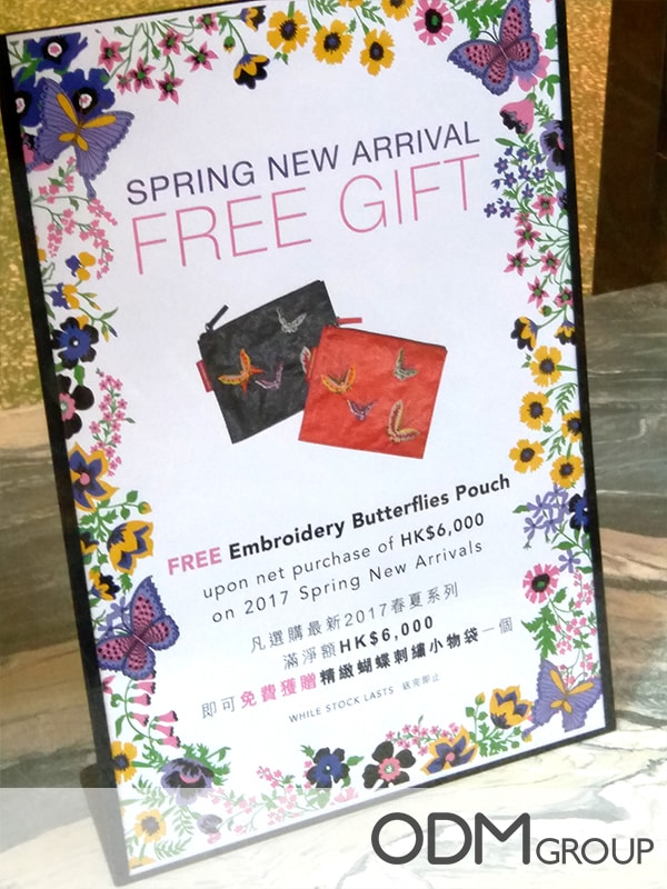 A clothing brand in Hong Kong came up with a promotional embroidery pouch with butterflies to stimulate the sales for their Spring collection. Every client who purchases up to 6000 HK$ on this line will receive a marketing gift.