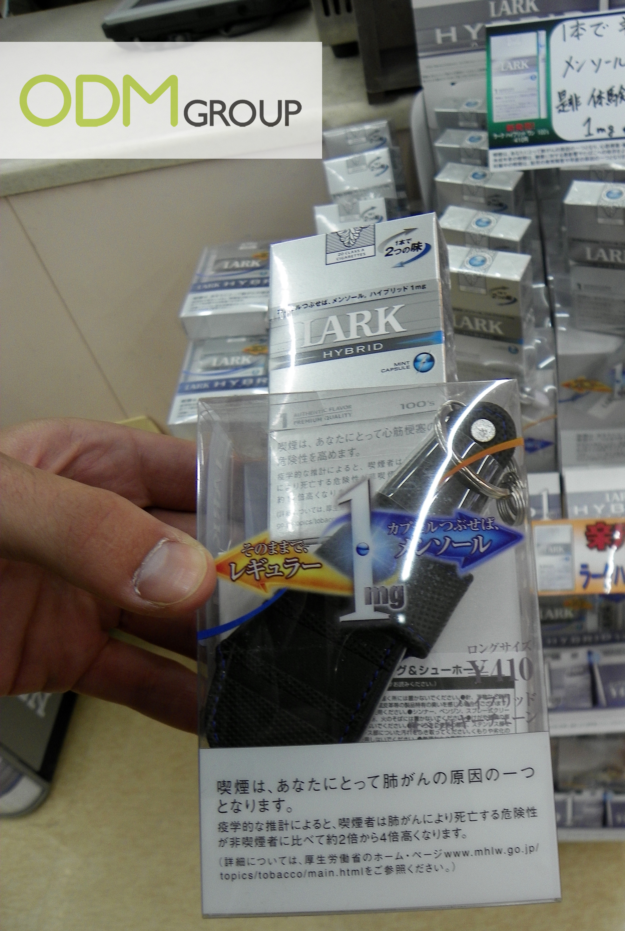 As we explained in this previous blog, certain countries still accept smoking in public spaces. Therefore using cigarette accessories to promote your brand can be a smart marketing strategy. For example, here is a gift with purchase promotion I spotted when in Japan, one of the few smoker friendly countries left. With each package of Lark Cigarettes bought, customers received free keychain/lighter holder.