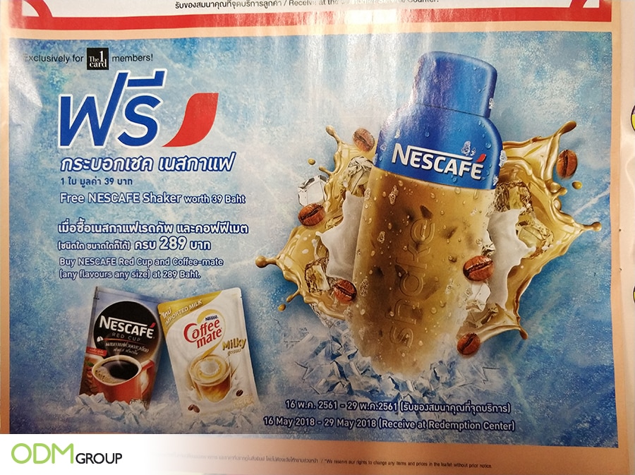 A custom shaker is one way to get people talking! We love this promotional incentive gift from Nescafe, who are providing customers that buy ‘Red Cup’ Coffee and Coffee-Matt with a complimentary customized shaker. This is a great example of how promotional marketing can help you achieve sales objectives. Indeed, using personalized promotional products is a great method for brands that want to boost sales.